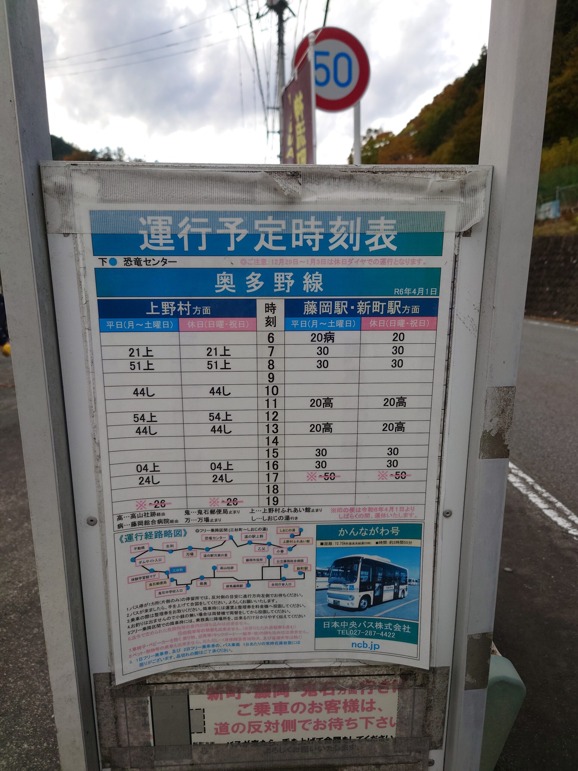 駅前のロータリーから奥多野線で恐竜センター行きが出ています。