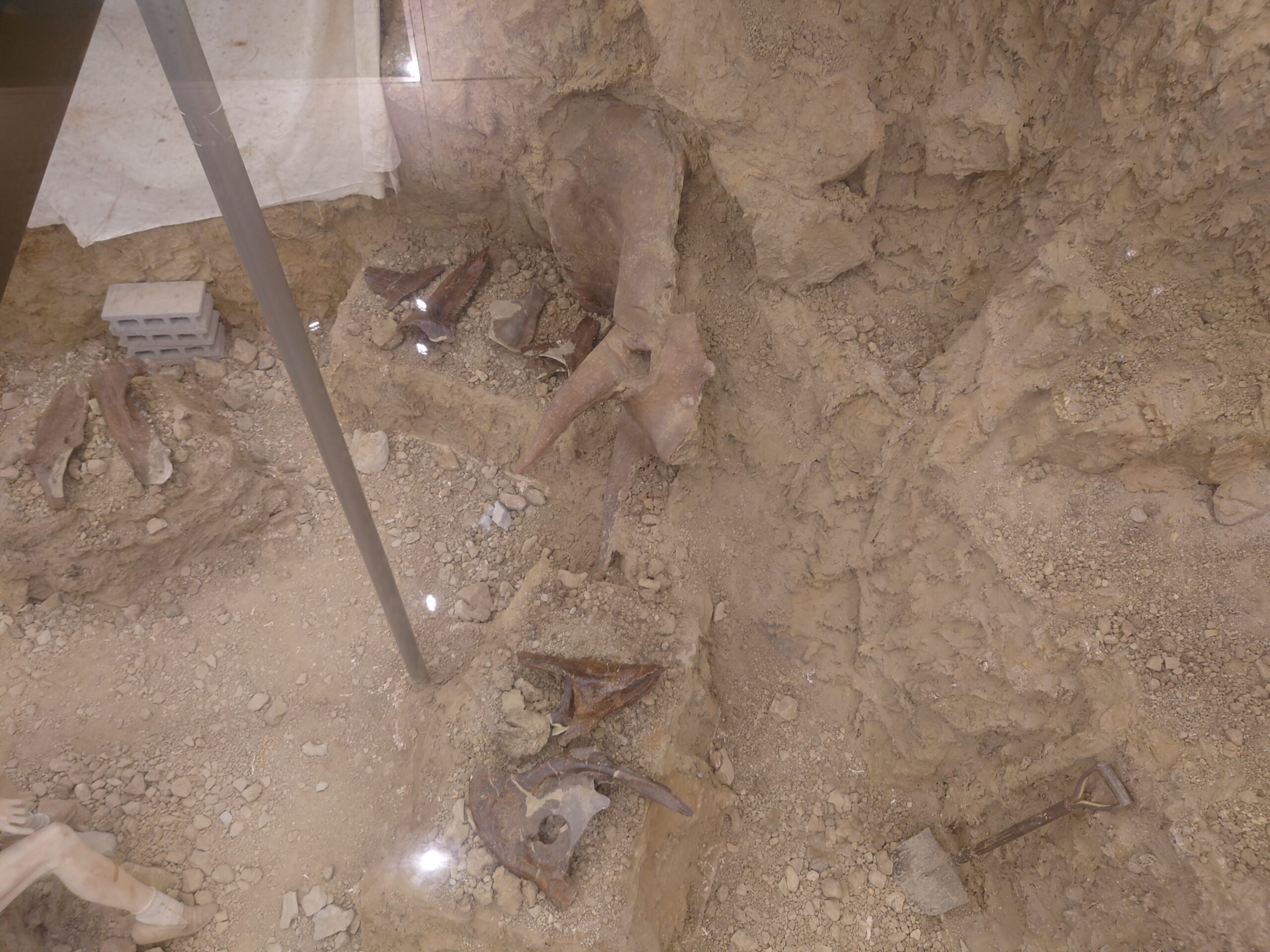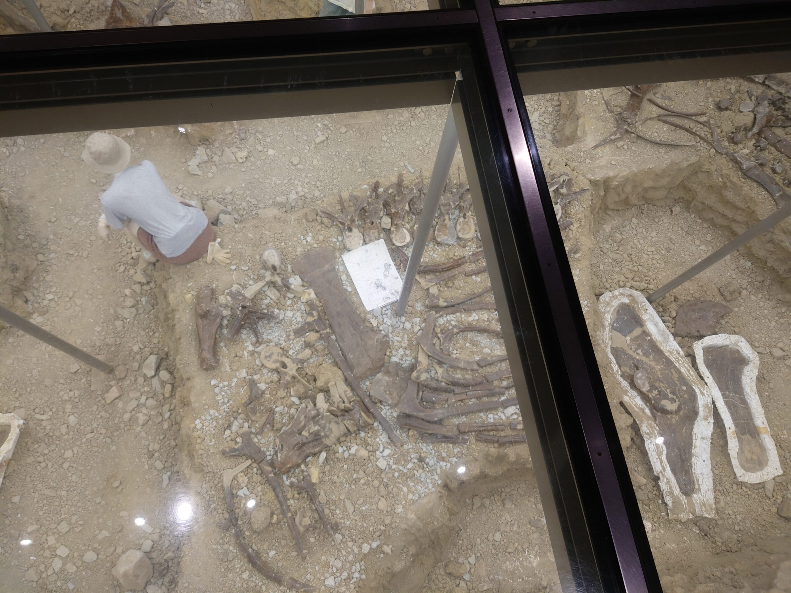 床の一部にはガラス張りのエリアがあり、その下には発掘現場の模型が展示されています。