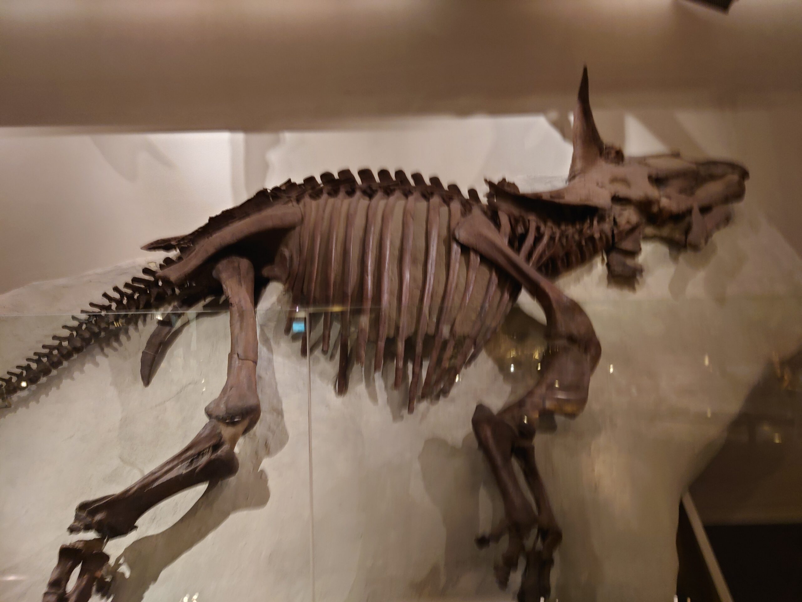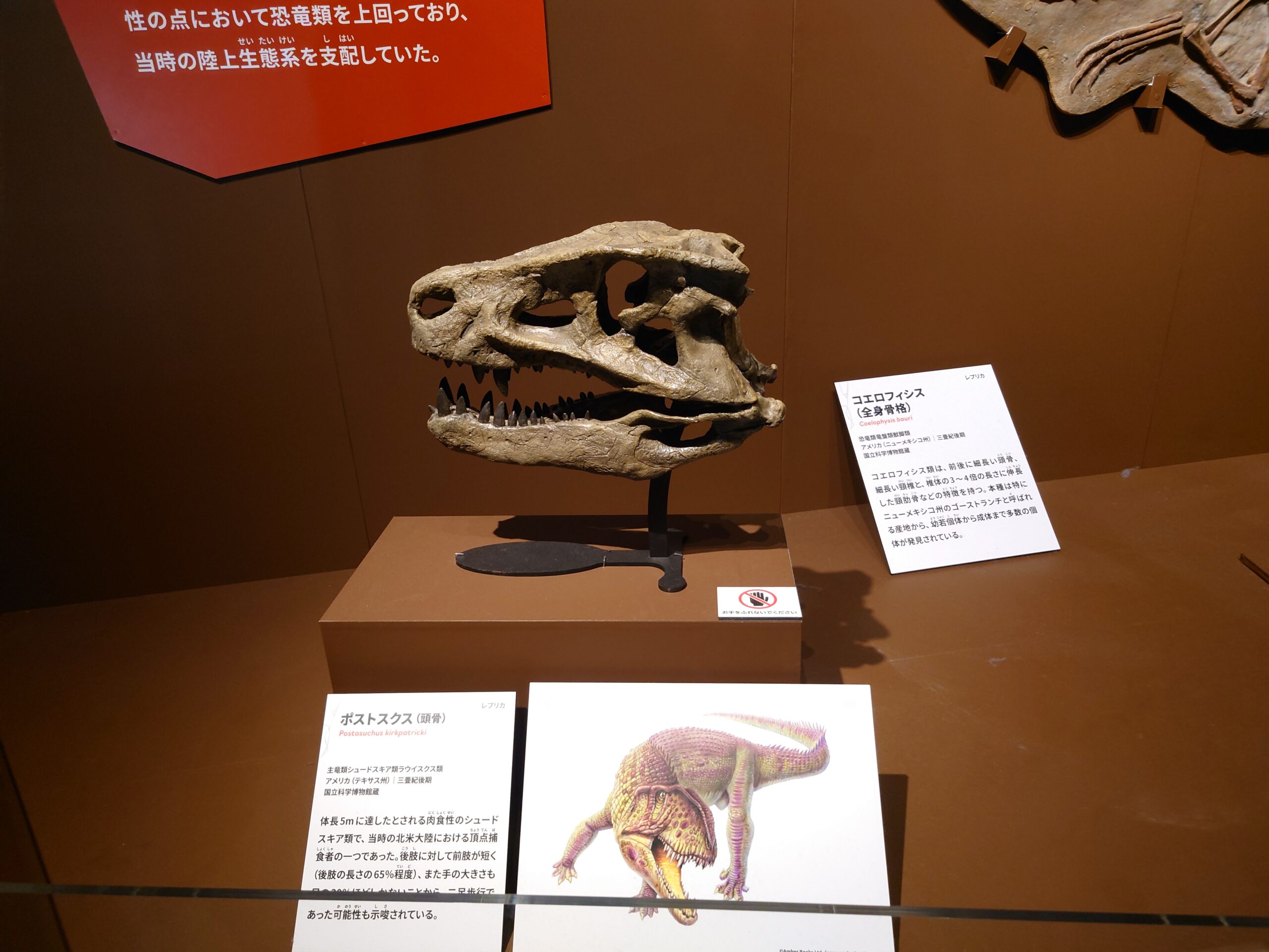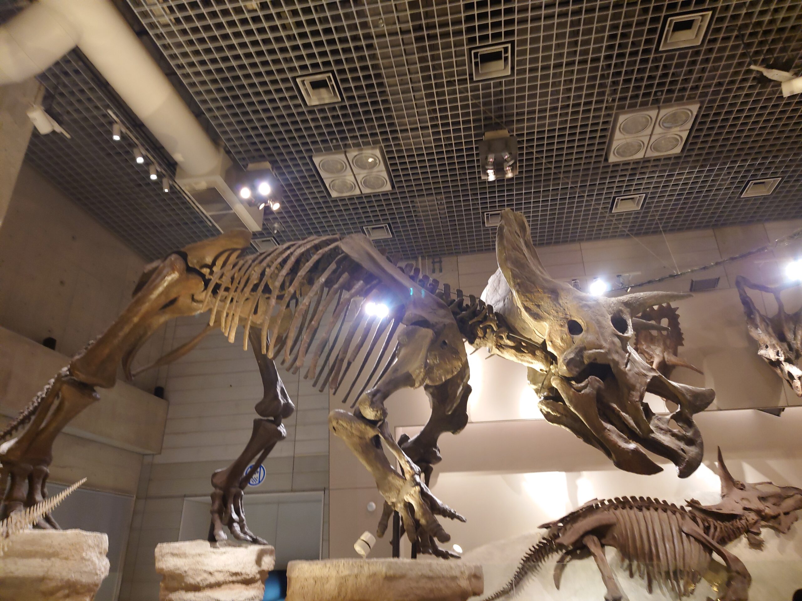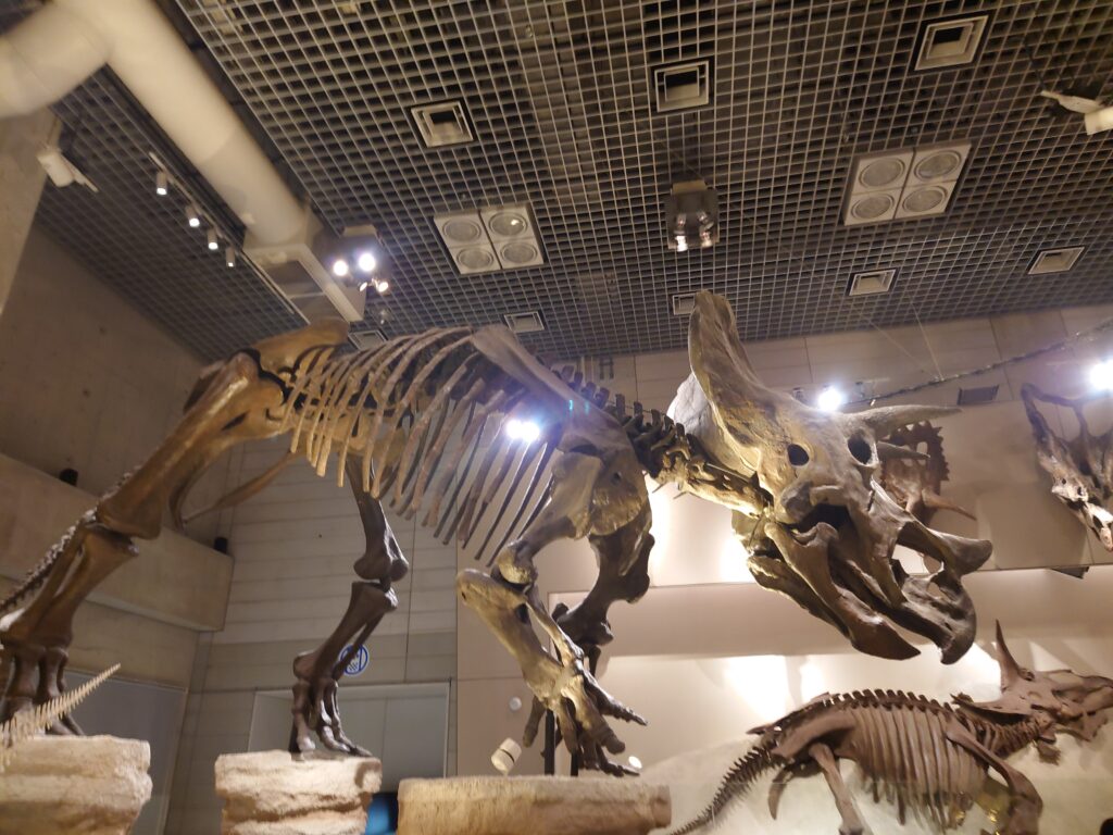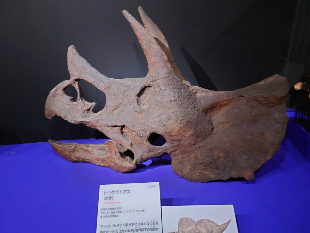 恐竜関連では、原寸大と言っても過言ではない巨大なトリケラトプスの頭蓋部分が強い存在感を放っています。